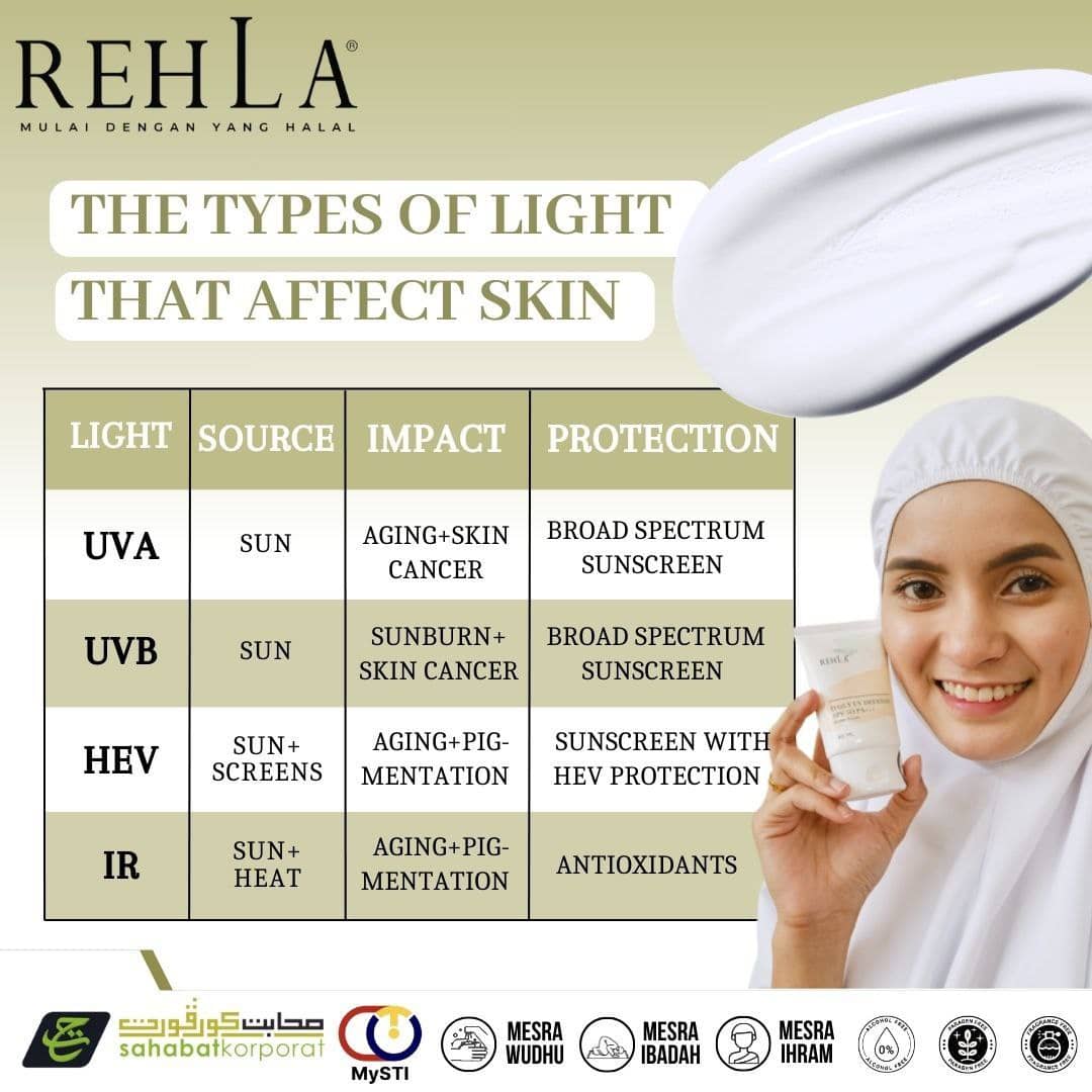 Untuk mengatasi bahaya ini, adalah penting untuk melindungi kulit anda dengan pelindung matahari yang boleh dipercayai. Rehla Sunscreen, produk halal berasaskan air dengan SPF50 PA+++, menawarkan perlindungan menyeluruh terhadap sinar UVA, UVB, HEV, dan IR. Formula ringan dan tidak berminyaknya sesuai untuk penggunaan harian, memastikan kulit anda kekal dilindungi tanpa rasa berat.